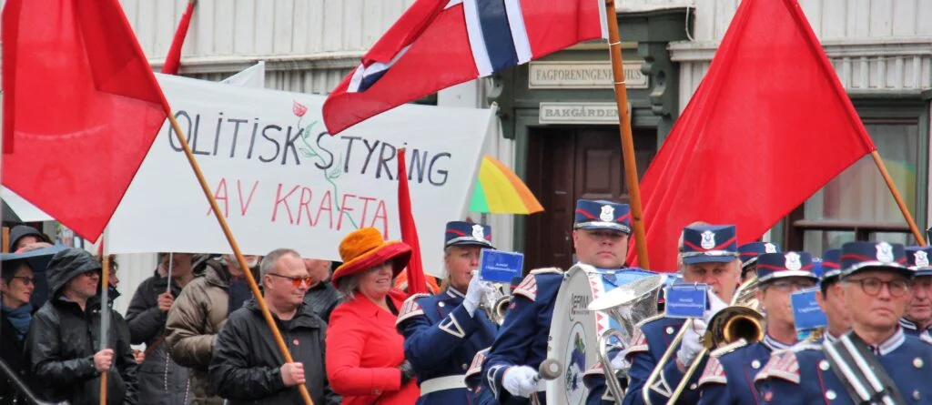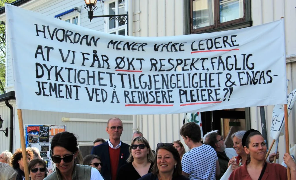 Seinare gjekk 200 i toget frå huset til Sam Eydes plass, solid opp frå 130 i fjor. Sjukepleiarane frå barne- og ungdomsavdelinga på sjukehuset stilte med det som truleg er den lengste parola til alle tider: Hvordan mener våre ledere at vi får økt respekt, faglig dyktighet, tilgjengelighet og engasjement ved å redusere på pleiere?! Dei samla utan samanlikning flest folk, det gjekk rundt femti her.