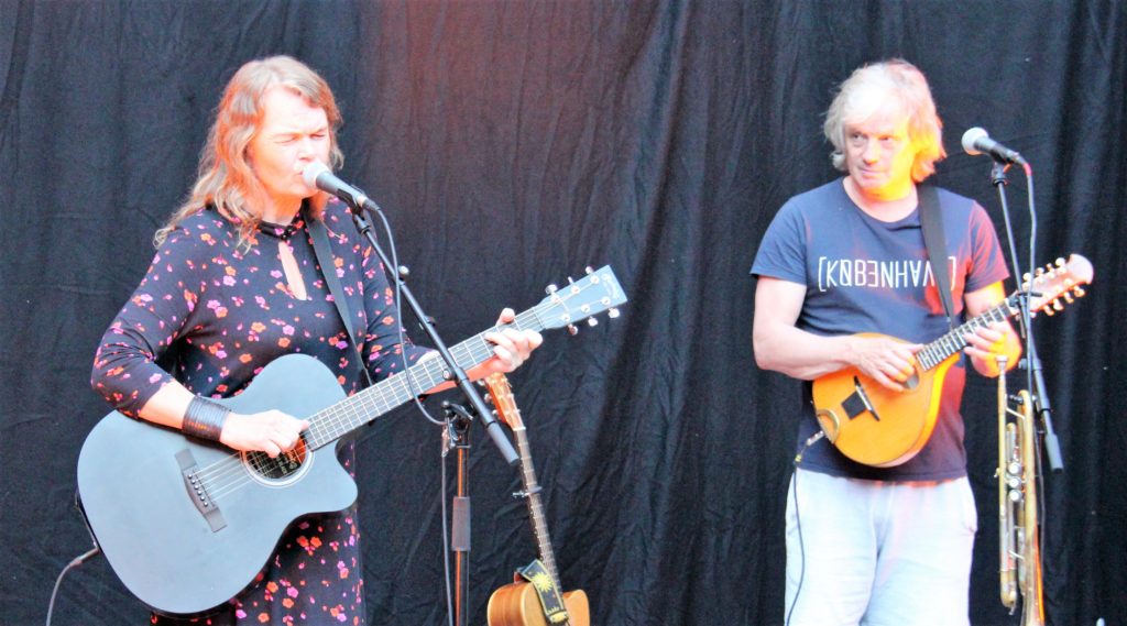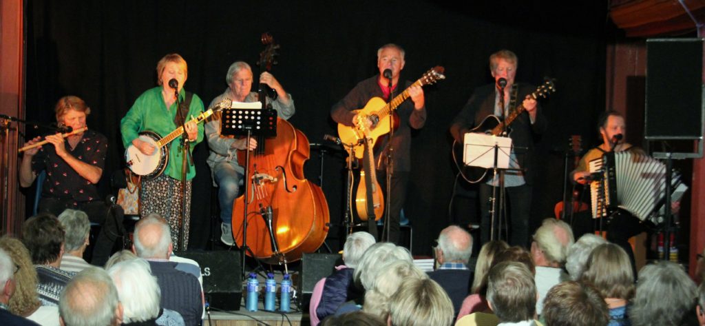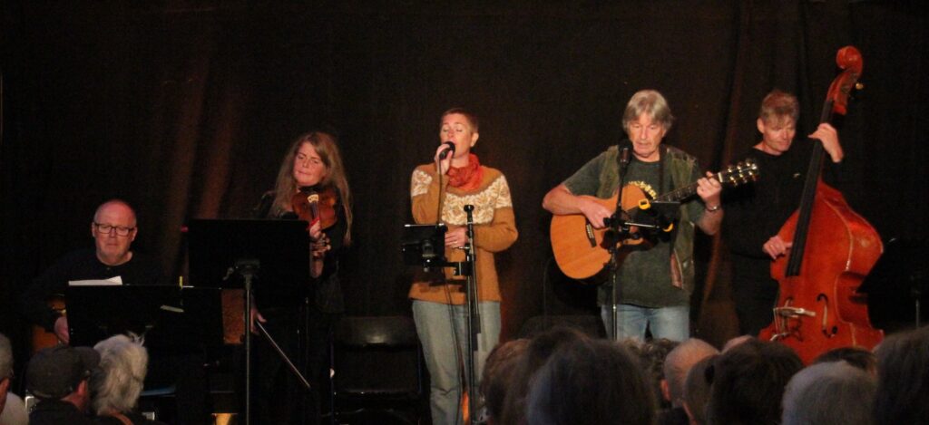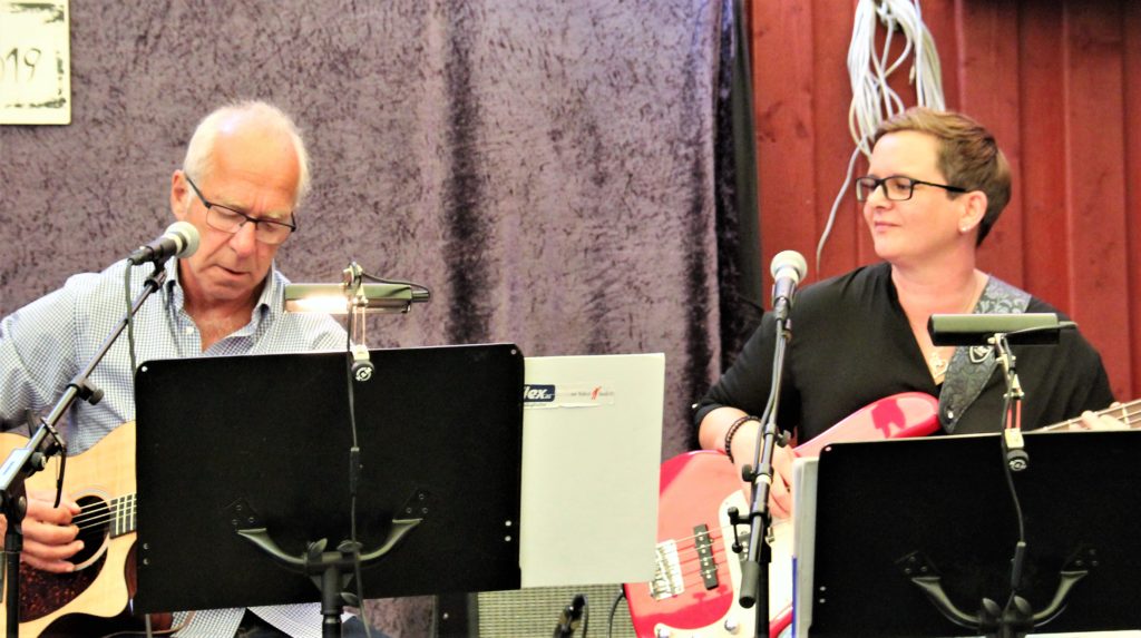 Me fekk ei blanding av gamle og nye innslag, med spenn frå vitsar til viser til rock, med kraftfullt spel og vakker vokal. Dei er ikkje amatørar med instrumenta sine. Frå Anders la i veg med Dylans Senor til ekstranummeret Sweet home Chicago der Thorbjørn førte an fekk publikum tjueseks innslag, og steminga under duken var god. Med gamle gode kjente som Leaving on a jetplane (Anitha); Sånne som oss (Thorbjørn); Games people play (Anita); Har du fyr (Karen Tobine); When morning comes to America; Krasafaren steinbu (Anders). Folk klappa til og song (eller nynna) med.