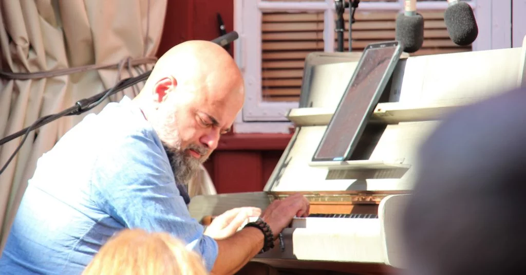 Gisle Børge Styve stilte med litt stakkato spel på tangentane og korte underlege lydar ut av munnen som blei til korte ord. Totland kom med, og igjen presist samsvar mellom musikken og dei pussige lydane.