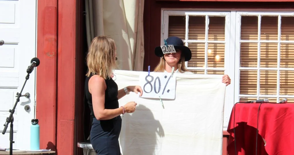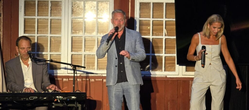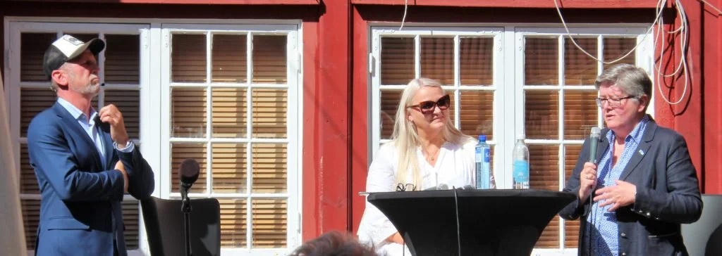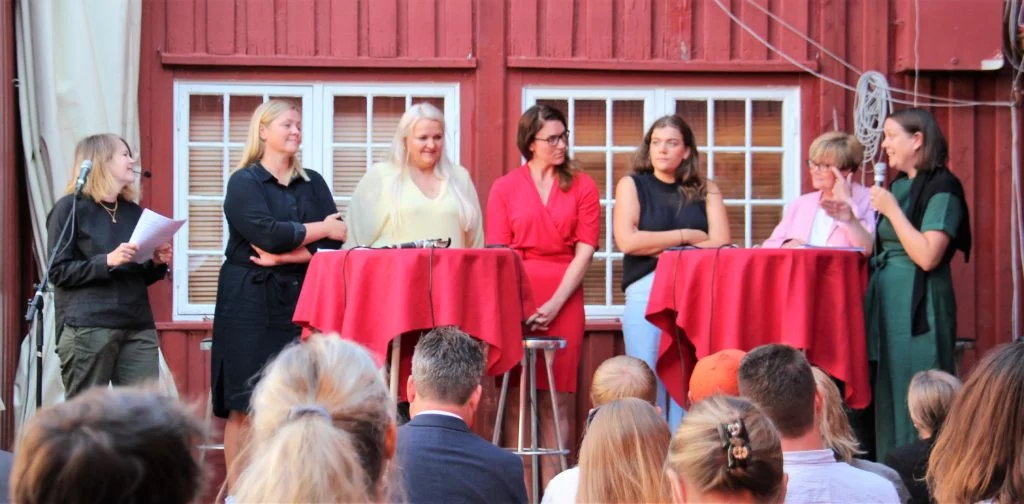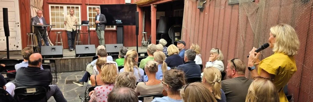 Torsdag kveld og aller siste arrangement i Bakgården i Arendalsveka 2025. Sofie Høgestøl ønska velkommen; her hadde ho sine første steg som programleiar saman med Harald Stanghelle, og det var ei ære å vere her. Det skjer magi i detta lokalet, sa ho.