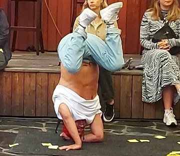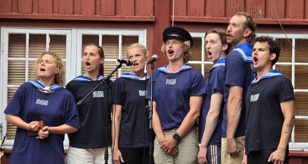 Det var ymse vinklar på dei ulike innslaga: To hyttearvingar som prøver jage det som til slutt viser seg vere ein frå bygningsrådet som etterlyser løyver. Namnet Lars blir straks endra til Lærs og får fram latteren. Båtpoliti som same dag har gått frå nattskift til dagskift, og som vil ta med seg folk frå publikum til arresten. Og ferskt innslag må me tru – “Fuck VG!” som ikkje tar Arendal med som sommarby. Siste før pause var ein innartiar – ein song om det seglande livet deira langs kysten, dei har ikkje dusja på vekesvis. Til melodien frå sjantyen Wellerman. Dei var i det heile tatt best på meir tradisjonelle scenenummer, der blei det i tillegg allsong. Og dei skal ha for slitsame hopp og sprell, etter først å ha gjennomført det same på lydprøve før konserten.
