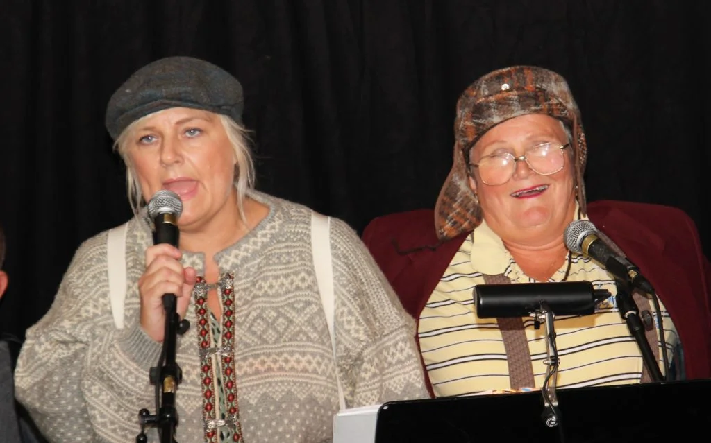 Gisle Børge Styve hadde eit lengre innslag om kunngjøringar i kjerka, møte, fest og basarar på bedehusa. Folk gaplo. Asbjørg Styve (94) er mora til Gisle Børge, og ho hadde faste innslag på eit av bedehusa i Bømlo med å lese dikt. Då det blei spelt av eit opptak der ho las “No ser eg atter slike fjell og dalar”, blei publikum heilt stille, og etterpå varm applaus.