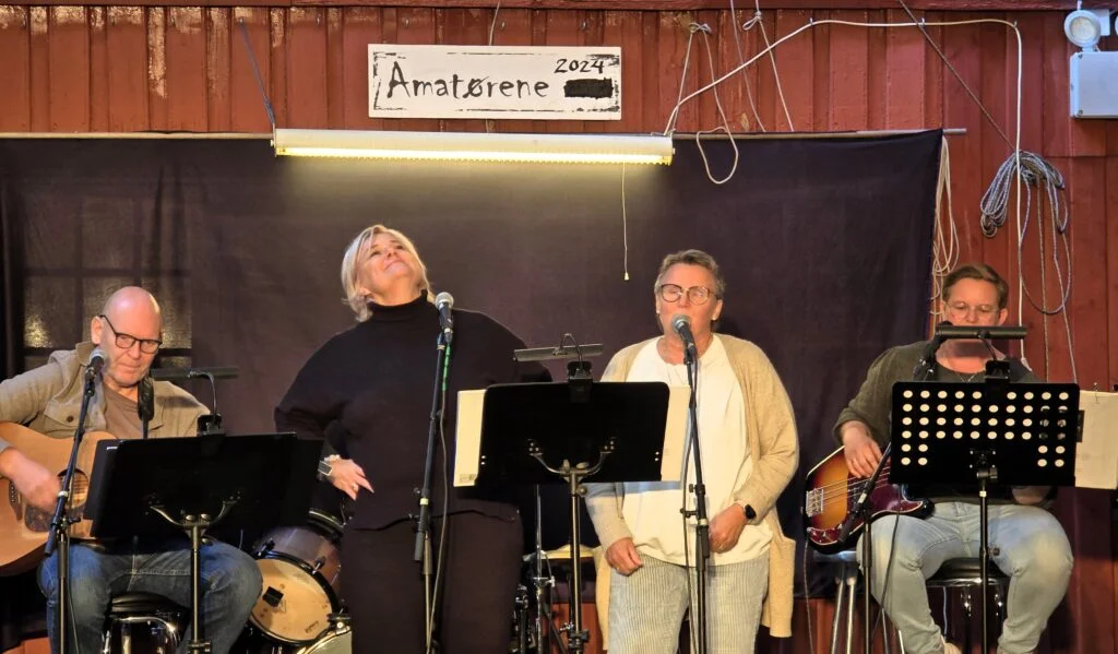 Amatørene opna for ny sesong i går kveld. Duken var oppe på grunn av det noko klamme og usikre veret, og nokre regndråpar plaga ikkje den godt fylte Bakgården. Som alltid serverte Amatørene viser, country og allsong, med nytt repertoar, frå det humørfylte til det vare. Olemann som var lei av sussinga kom utanfor den oppsette lista. Å i sava høyrer til det humoristiske, om ein fuktig båttur, framført med godt trøkk. Fuktige båtturar kan ende med drukning, men her drukna teksten.