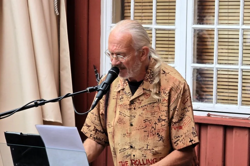 Vinden ruska litt i papira hans (han var ein analog mann), det tok han med godt humør. Bakgården var fylt opp, eit stort fleirtal med grått hår, og som tydeleg kjente mannen og musikken hans frå før. Dei klappa og song med innimellom, men for alvor til Daddys longlegs, då mørket fall på, som han kommenterte. Etter to timar og drygt tjue melodiar gjekk folk smilande ut i kvelden.