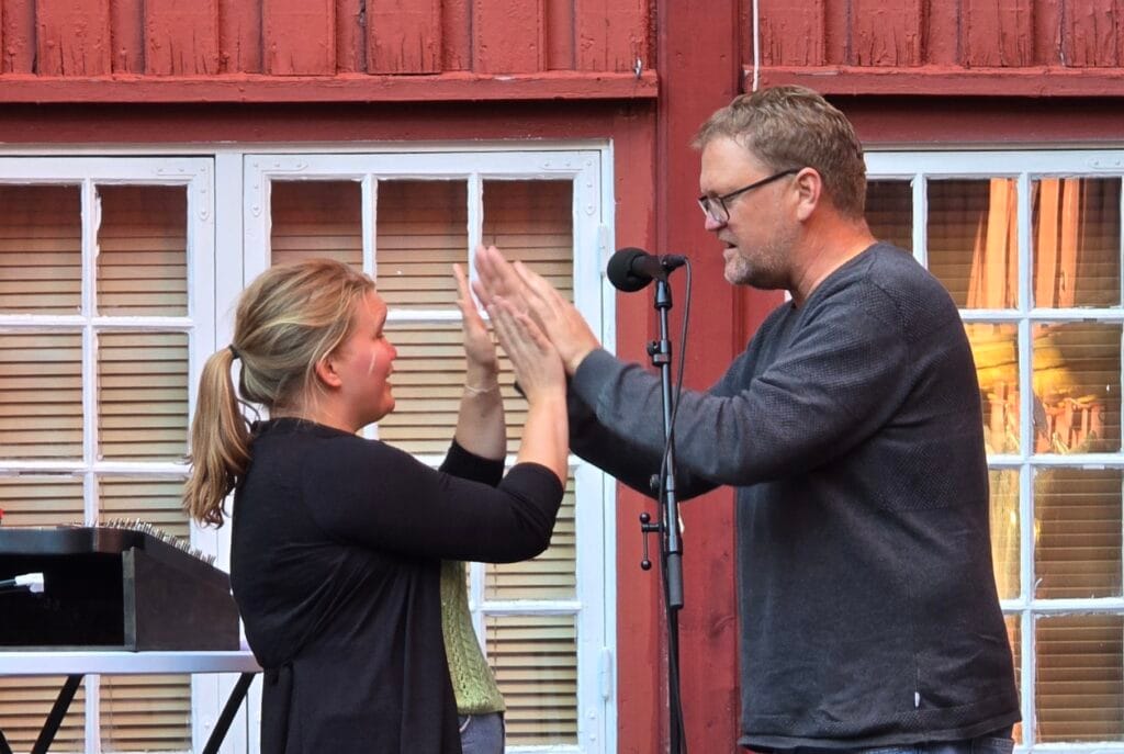 Dei kom så med Klappeleik som finst i tallrike variantar som ungar har brukt rundt om i landet. (- Kan du huske den gang i de fingerløses land…) Byttingsmyr og Moen stod mot kvarandre og klappa mens Tønnevold Fiane trakterte trøorgelet. Versjonen her hadde dei frå eit opptak med elevar på Stinta skole i 1977! Tradisjonsmusikk finst ikkje bare i dalstrøka innafor, men au i meir urbane strøk. Fornøgd latter og taktklapping undervegs og applaus etterpå.