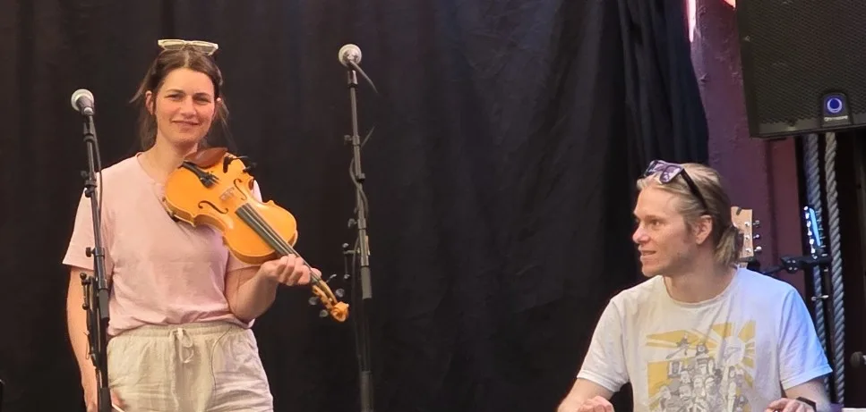 Flottorp og Solberg junior med to meldodiar; ho hadde vanskar med konsentrasjonen når dei andre vitsa. Åsmund fortalde at Johanne Flottorp var aleine på Spelamannsprisutdelinga, sendte foto til han av seg sjølv med prisen, og han sendte foto tilbake av kona som fekk lystgass på fødeavdelinga. Johanne har ein eittåring og ungen til Solberg er åtte veker. Og innimellom høyrde me barnegråt frå bakrommet.